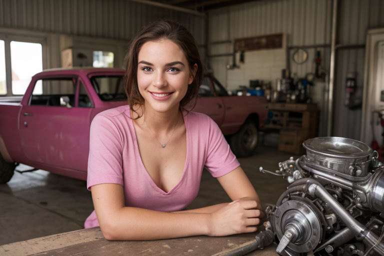 - 1beauty with smile,(Zoom in on her face:1.3), looking at viewer,deep V-neck pink T-shirt,work coveralls of mechanic,one engine on the table,