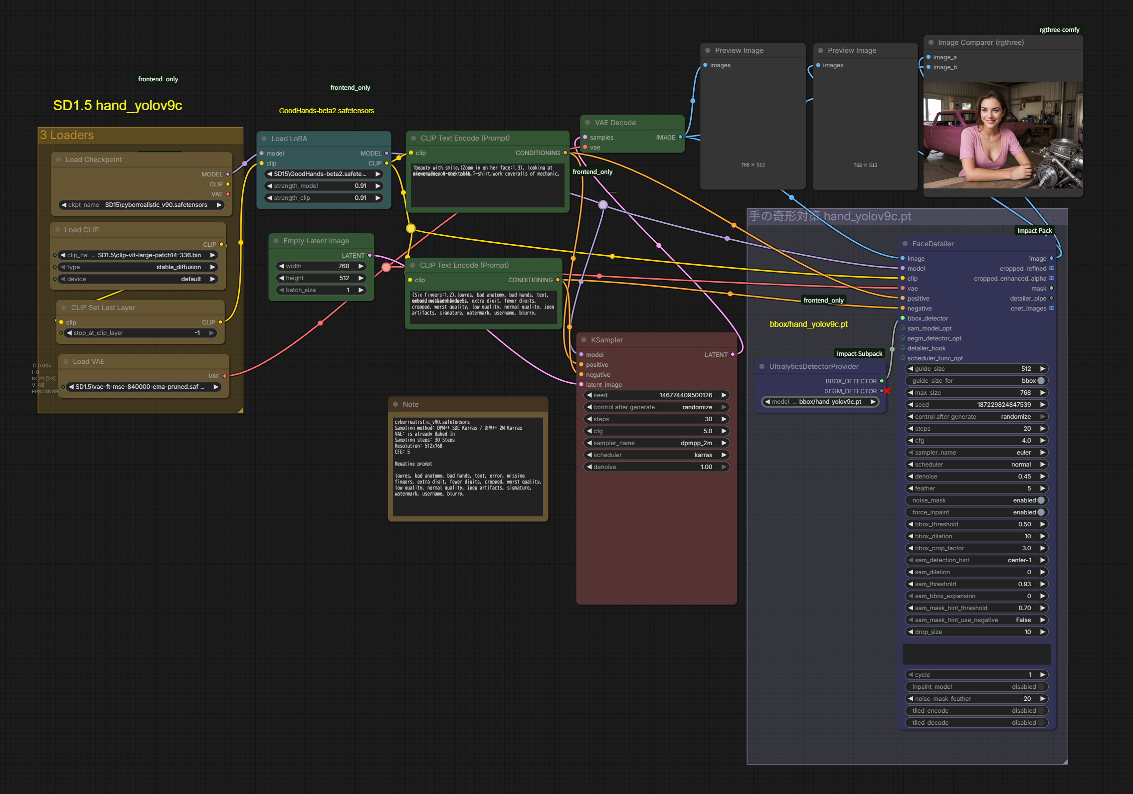 - Face/Hand Detailing: UltralyticsDetectorProvider bbox/hand_yolov9c.pt