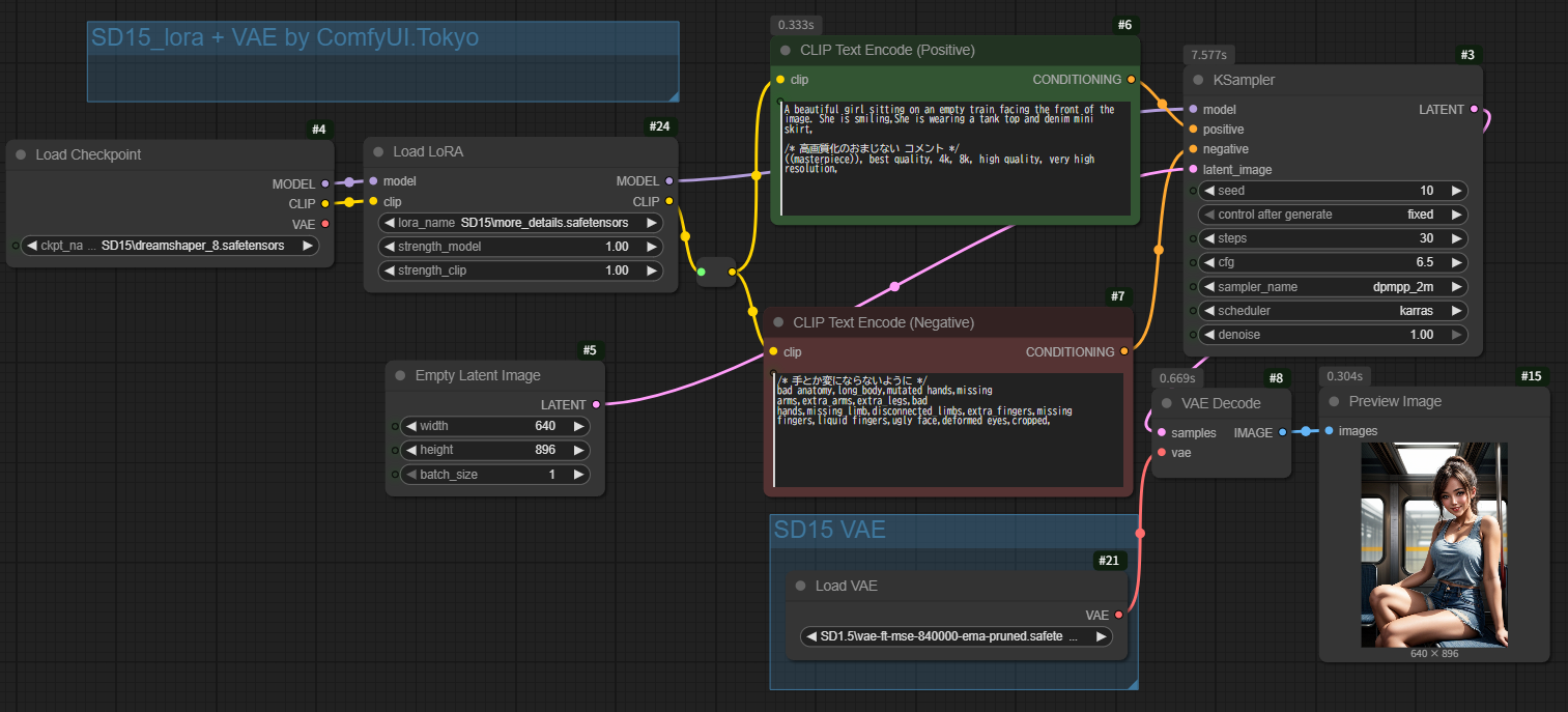 LoRAの接続の仕方は、Checkpointとプロンプトの間に縦続接続する格好となります。