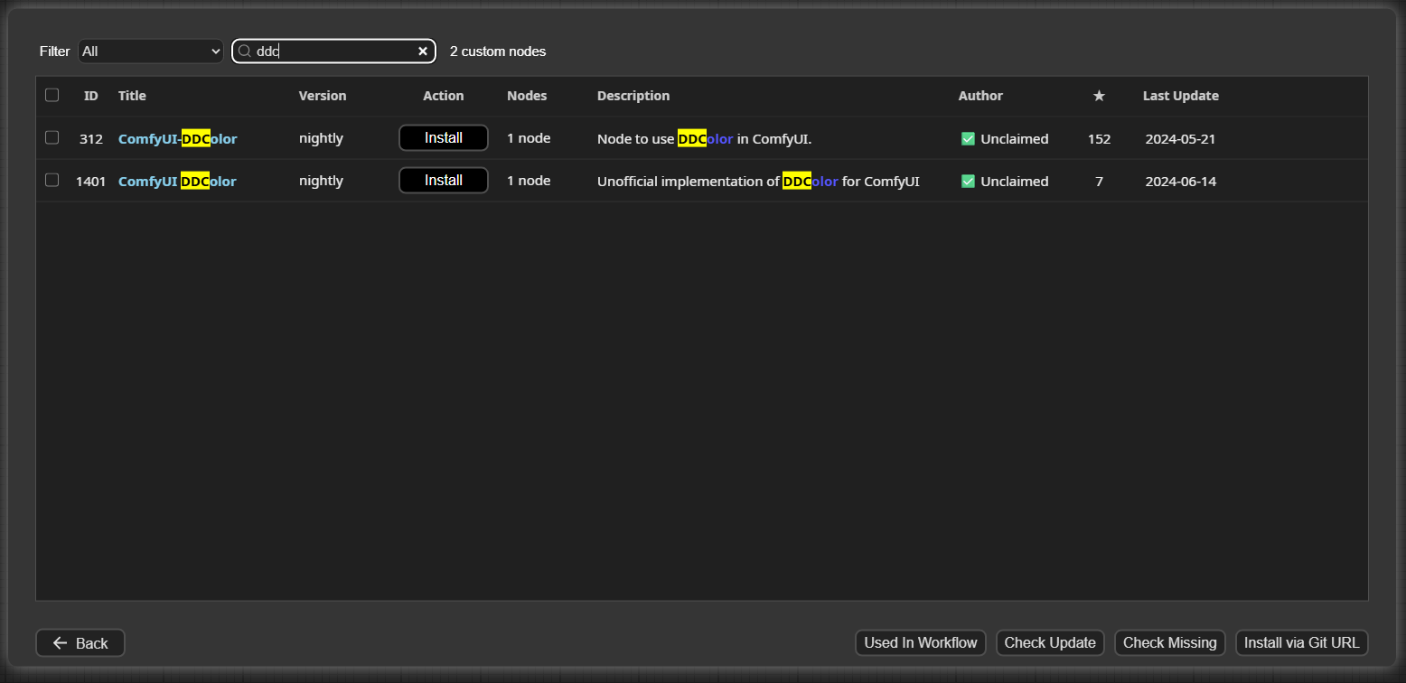 ComfyUI Manager で DDcolor を検索し、ID 312 のComfyUI-DDColorをインストールします。