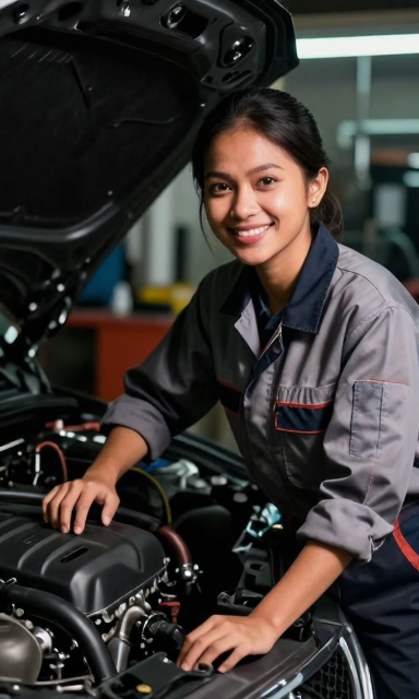 - An Indonesian female mechanic in coveralls leans back from the engine bay, wiping her hands with a rag. She gives a confident, bright smile directly to the camera. Workshop background. Photorealistic. --ar 3:5