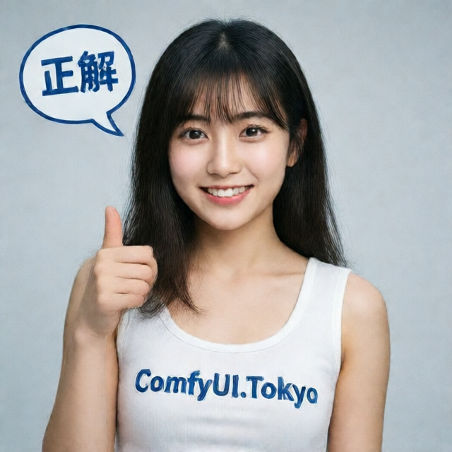 - 背景:白, 画面左上に青線のBubble Speechに'正 解'と書いてある。smiling , 最高の美女、18歳、一人の日本人、カメラ目線、白いtank-top, 彼女のタンクトップの胸の中央に大きく'ComfyUI.Tokyo'と読める, 彼女は、上を指さす。 medium breasts, slender build, 美しい顔、大きな目, (masterpiece:1.3), best quality, ultra detailed, highres, 8k,