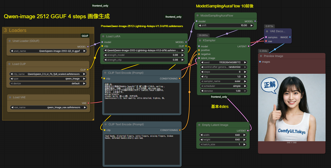 - 4stepsの意味: 通常、AI画像生成には20〜50回ほどの計算(ステップ)が必要ですが、このモデル(またはLoRA)を使用すると、わずか 4ステップ で高品質な画像が完成します。
