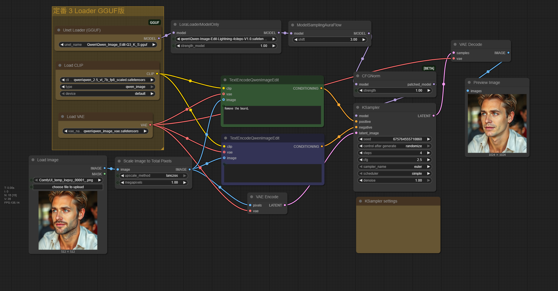 このノードはマスク画像も入力として受け付けることができます。これにより、ユーザーは画像のどの部分を変更したいかを正確に指定できます。例えば、特定のオブジェクトを置き換えたり、色を変更したりする際に、マスク画像を使って編集範囲を限定することができます。 - ワークフローの簡素化