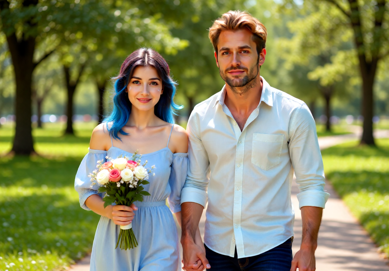 1 sweet couple walking at the park and their eyes facing the camera. The woman man is holding a bouquet of flowers and holds the man's arm.