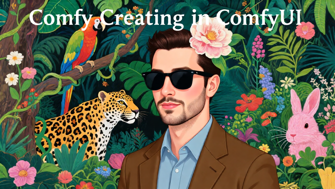 Change the character to a male one. He should also be fashionable and wear sunglasses. Add the text 'Comfy Creating in ComfyUI' at the top of the image. Pay attention to the capitalization of the text. The character should not block the text.