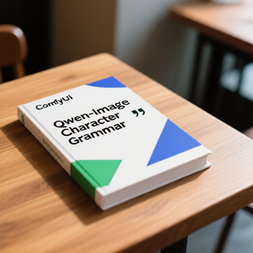 A realistic scene showing a book placed on a wooden table in a café or study room. The book cover features the title 'ComfyUI Qwen-Image Character Grammar' in large bold letters, centered on the cover. The cover design uses a clean white background with subtle geometric accents in blue and green. The text is in a modern sans-serif font, sharp and evenly spaced. Stylized quotation marks or brackets are added around the title to suggest grammar and syntax. The overall layout is minimal and professional, with the title clearly readable and dominant. The perspective should show the book lying flat on the table surface, with natural lighting and slight shadows. |