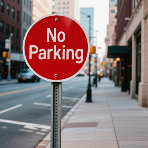A round traffic sign with the words 'No Parking' in bold white letters on a red background, mounted on a pole beside a city sidewalk. The sign is clearly visible and positioned near the edge of a pedestrian walkway, with urban buildings and street elements in the background. |