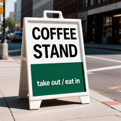 A street stand signboard placed on a city sidewalk. The sign displays the word 'COFFEE' in large bold letters at the top, and below it the word 'STADND' in bold letters. At the bottom of the sign, the phrase 'take out / eat in' appears in small white outlined lowercase letters. The signboard is standing on the pavement, with an urban street background.