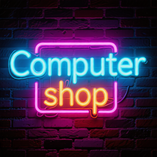 'Computer shop' colorful neon sign on brick wall background. |