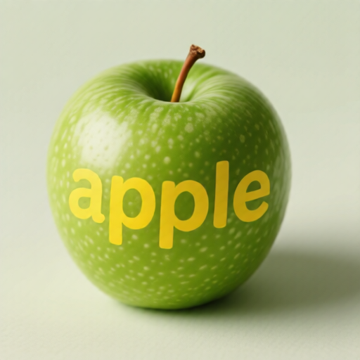 The word 'apple' in yellow is written on the side of the green apple . |