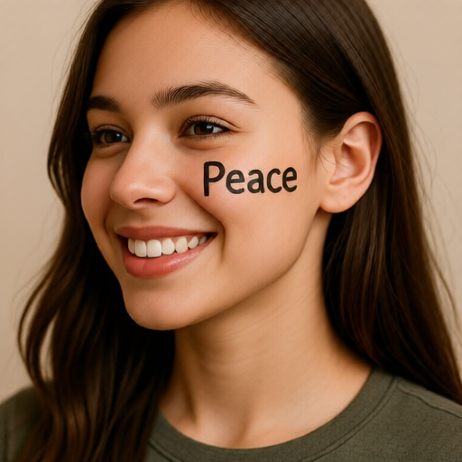 The word “Peace” is written on the cheek of a beautiful girl smiling. |