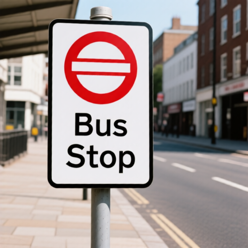 A British-style bus stop sign on a city sidewalk. The sign is rectangular with a white background and a red circle at the top containing the words 'Bus Stop' in bold black letters. The sign is mounted on a pole beside the road, with urban buildings and pavement in the background.