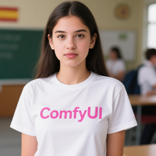 Her white T-shirt reads "ComfyUI" colored pink |