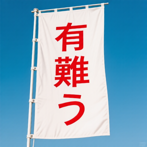 a large banner with the text "有難う" written in bold red Japanese kanji, centered at the top |