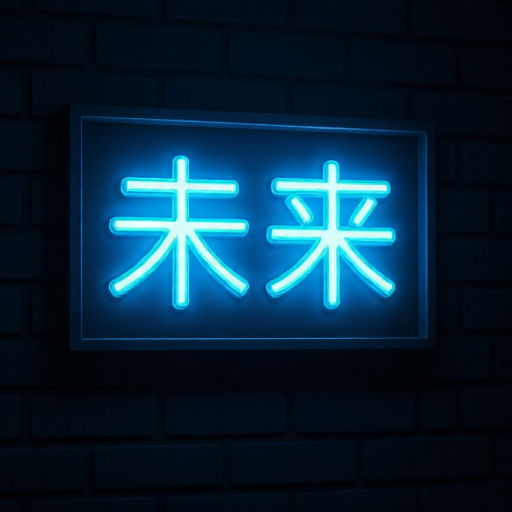 A sign showing the Japanese word "未来" in glowing neon blue letters