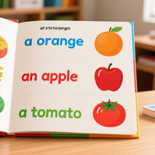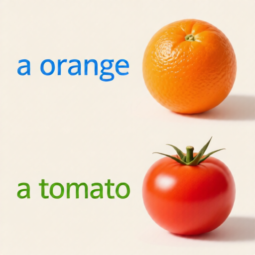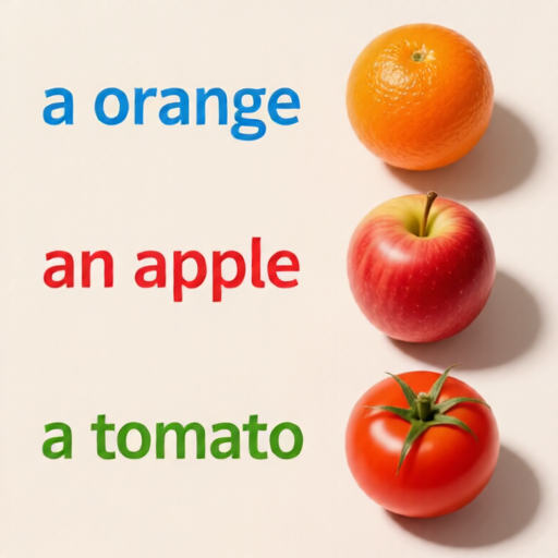 at the bottom left: 'a tomato' in smaller letters colored green