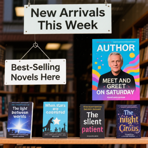 Bookstore window display. A sign displays "New Arrivals This Week". Below, a shelf tag with the text "Best-Selling