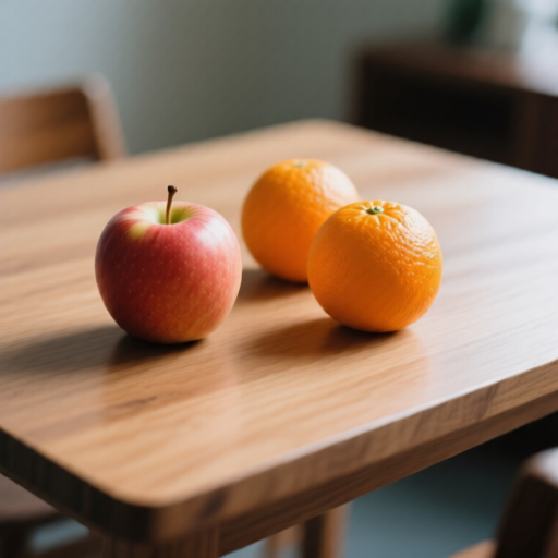 (lang: ja) テーブルの上に1個のりんごと2個のオレンジがある。 |