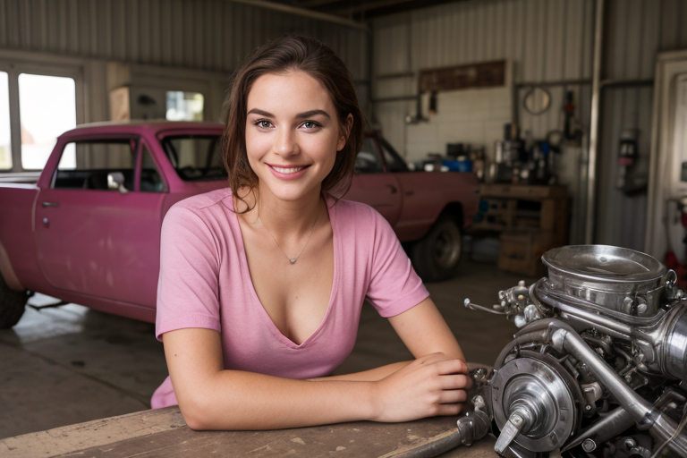 - 1beauty with smile,(Zoom in on her face:1.3), looking at viewer,deep V-neck pink T-shirt,work coveralls of mechanic,one engine on the table,