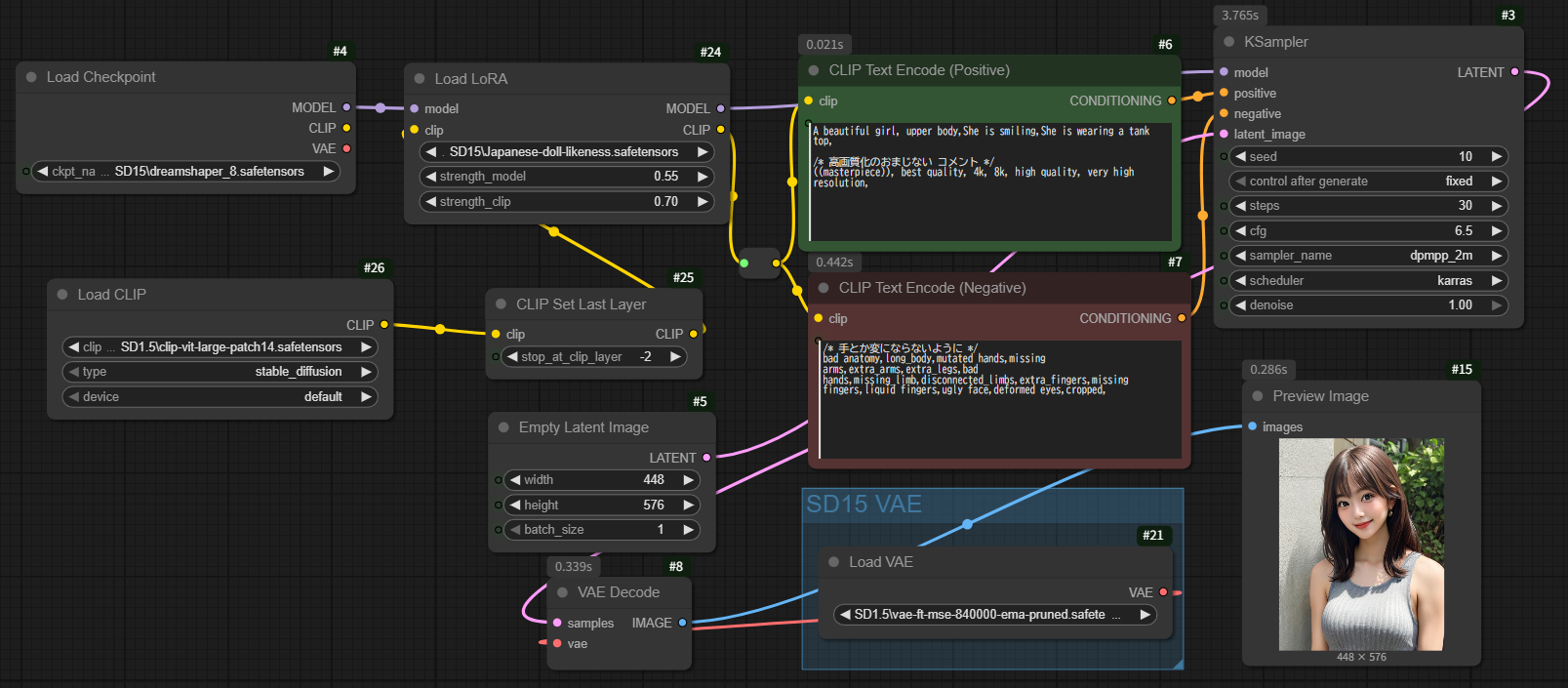LoRAの接続の仕方は、Checkpointとプロンプトの間に縦続接続する格好となります。