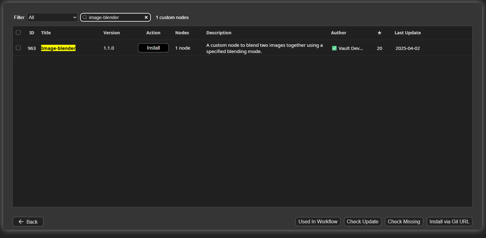 ComfyUI Managerでimage blenderを検索してインストールです。
