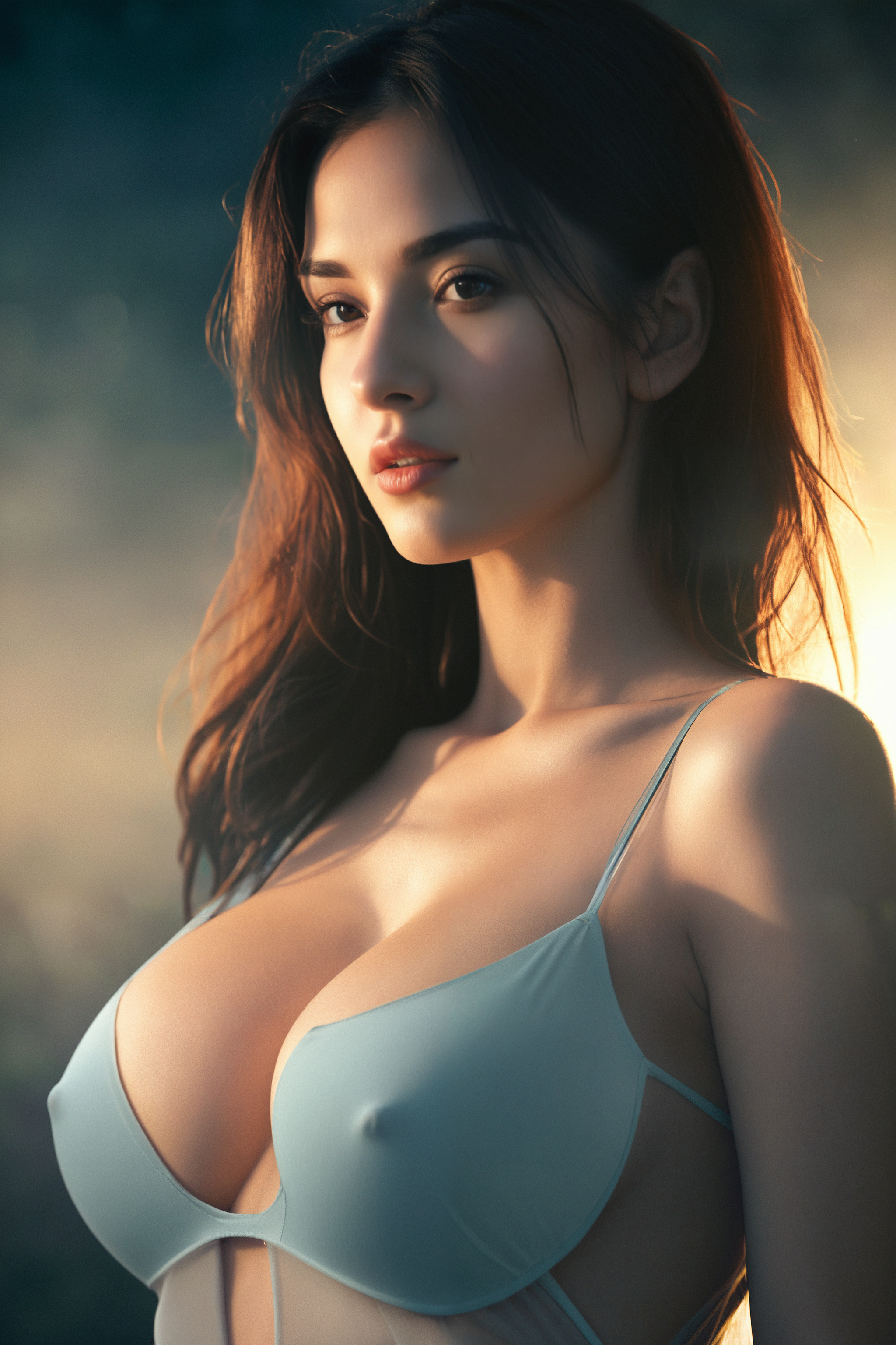 - (masterpiece), (best quality), ultra-realistic, cinematic photography, professional gravure photoshoot of a beautiful actress, natural outdoor setting, daytime sunlight softly filtered through trees, soft diffused lighting, reflector fill light on her face and body, balanced highlights, perfect skin tone, subtle backlight halo around hair, studio-quality fill light, creamy smooth bokeh background, sharp focus on subject, photo taken with a Canon RF 85mm f/1.2L lens